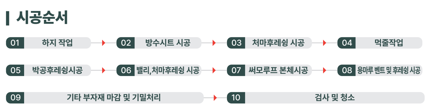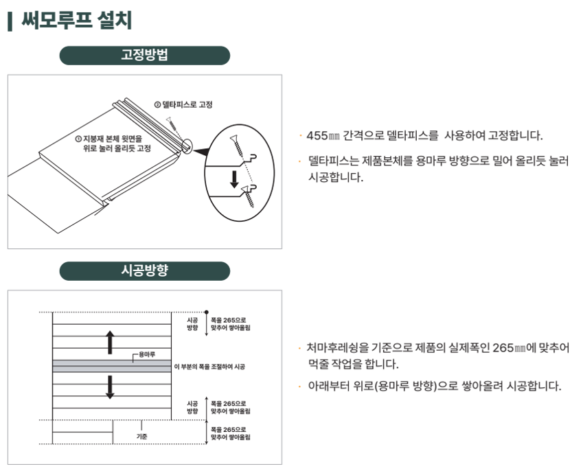알루미늄과 갈바륨으로 도금된 강판을 불소코팅하여 만든 최신식 지붕재입니다. 신축지붕 뿐 만 아니라 기존지붕 리모델링에도 시공이 간편하며, 방수시트를 붙이고 그 위에 써모루프를 시공하는 "커버 공법"을 시현합니다. 리모델링시에도 기존 도장공사 또는 타 지붕 자재보다 긴 수명을 유지하며, 기존 지붕을 철거하는 비용이 들지않으므로, 뛰어난 경제성과 폐기물을 최소한으로 줄여 자연 친화적인 장점을 지니고 있는 신개념 지붕재입니다.